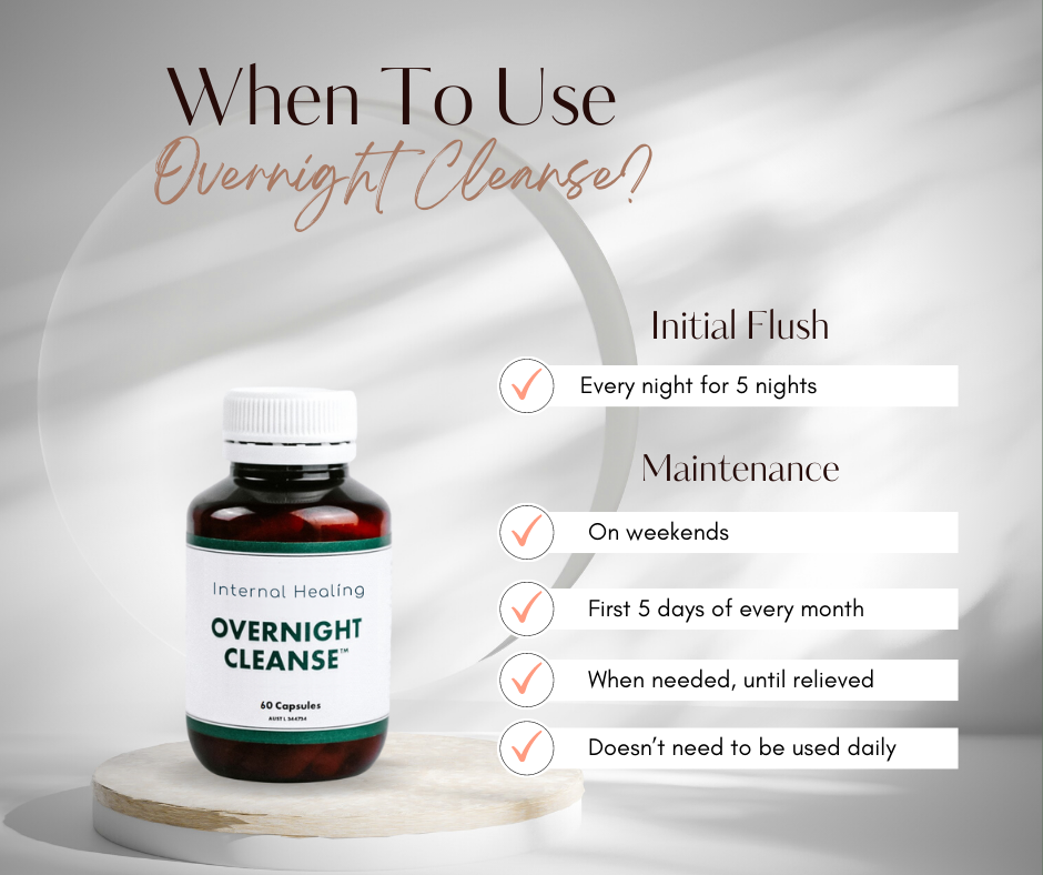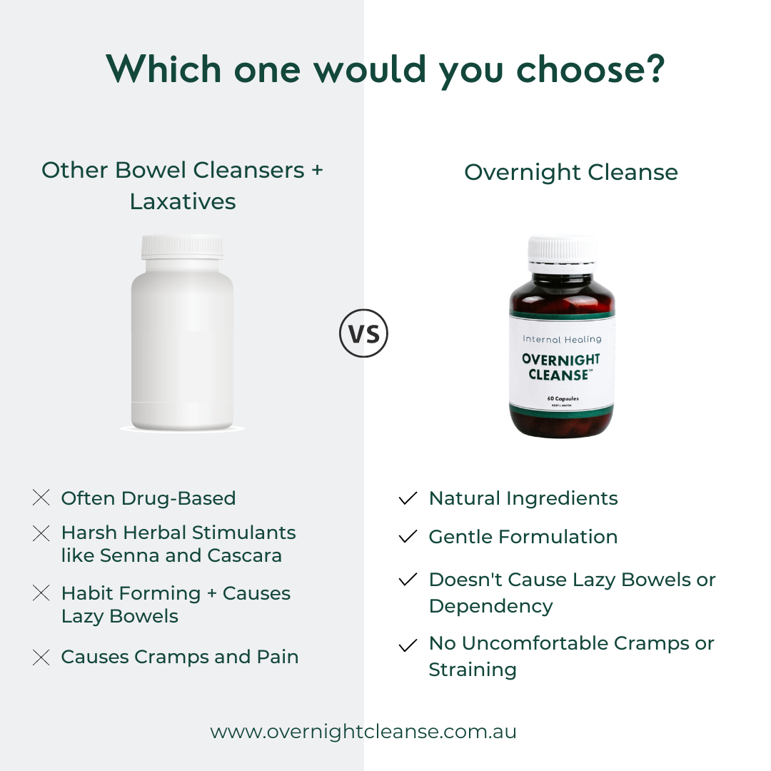 How does it work? The Overnight Cleanse is formulated to support healthy bowel function and gently clings to compacted stools and toxic buildup in your colon and breaks them down in a way that makes them much easier to pass out of your body – NO CRAMPS or STRAINING!